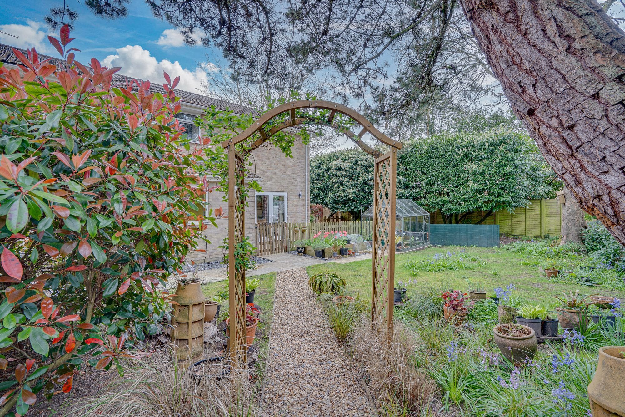 The property features an impressive frontage with a spacious gravel driveway, providing ample parking for multiple vehicles. There is gated pedestrian access to the garden, along with entry to the detached garage. The remaining frontage is attractively landscaped with a variety of shrubs, and a footpath leads to the front door. The established wrap-around garden offers a generous lawned area, complemented by sections of mature trees and flowering plants. An additional area has been finished with artificial lawn, alongside a large paved seating space—perfect for outdoor entertaining.