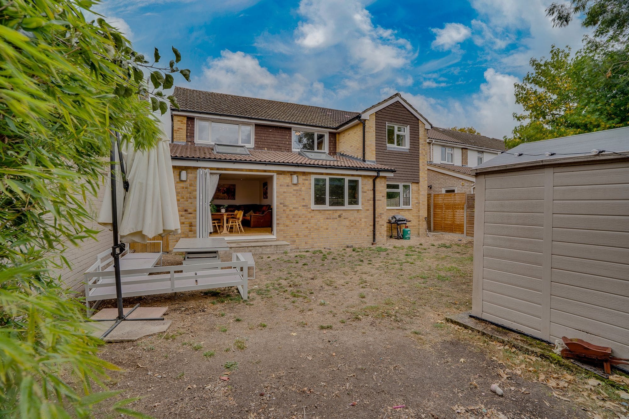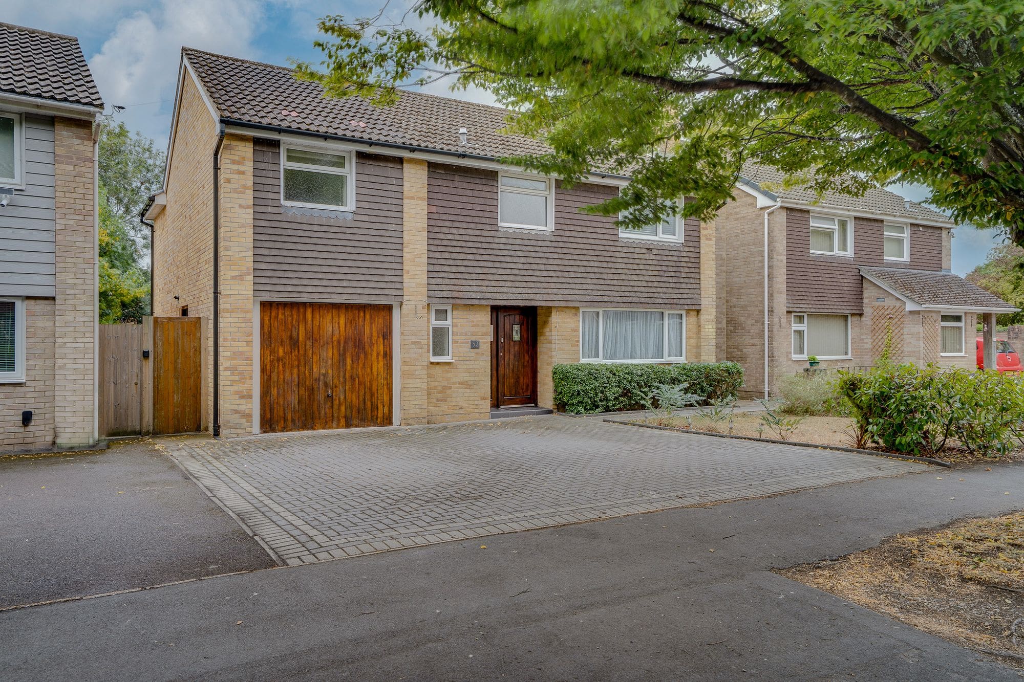 To the front of the property, a spacious driveway offers off-road parking for multiple vehicles and leads to a converted garage, now providing useful storage space. The front garden is neatly laid to lawn with established planting, enhancing the property’s kerb appeal. A side gate provides access to the rear garden, which is fully enclosed and predominantly laid to lawn, complemented by a paved patio area ideal for outdoor entertaining.