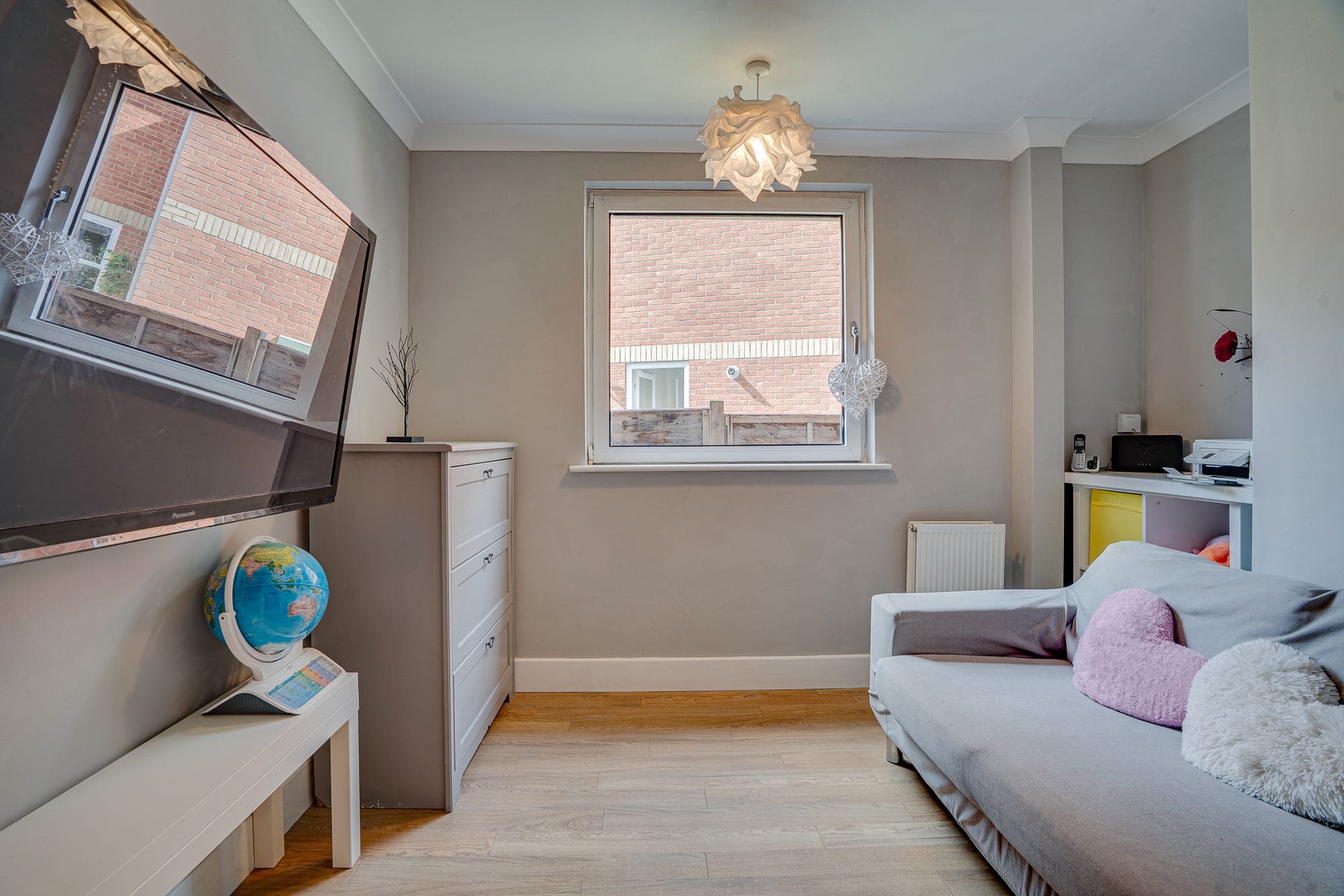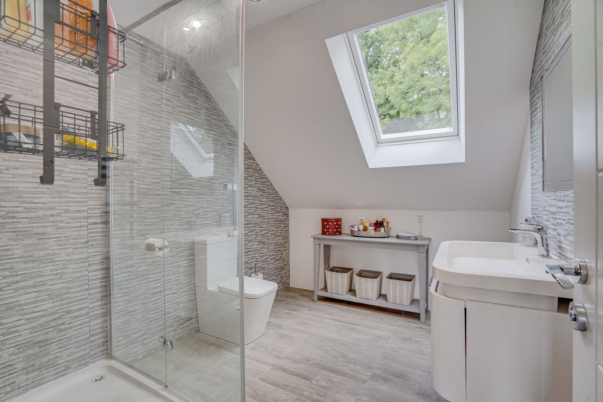 On the ground floor, you’ll also find a generously sized bedroom and a family room (currently used as a salon) with a rear-facing window—ideal as a playroom, home office, or guest space. The ground floor bathroom features a modern suite comprising a corner shower, vanity sink unit, WC, and bath with complementary tiling. Upstairs, the first-floor landing provides access to three bedrooms, the family bathroom, and an additional storage cupboard. The master bedroom overlooks the rear garden and benefits from a walk-in wardrobe and an en-suite bathroom with a Velux window, vanity sink, corner shower, WC, and stylish tiling. Bedroom two includes fitted wardrobes and a front-facing window, while bedroom three is positioned at the rear of the property.