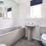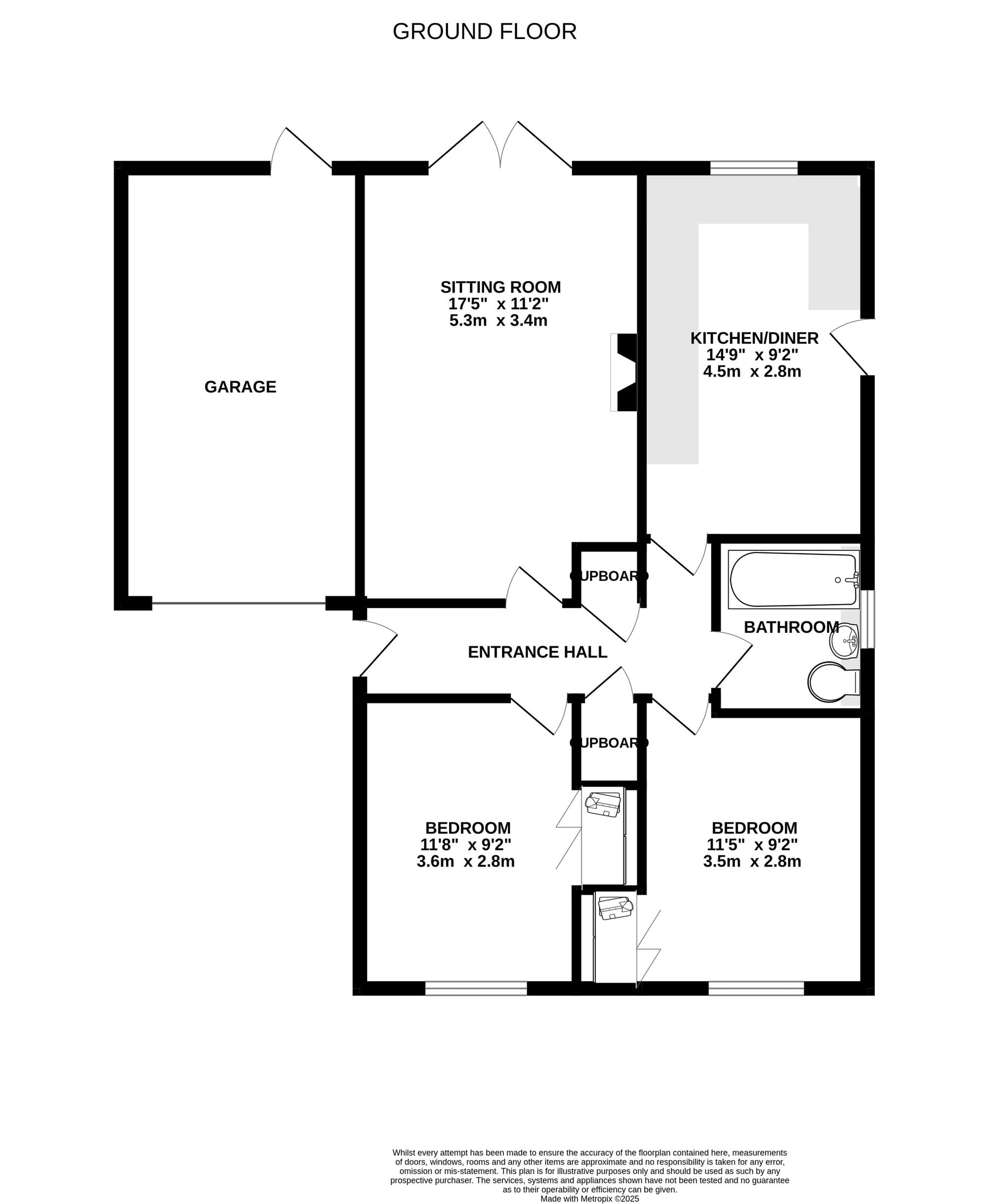 You are welcomed into the property via a spacious entrance hall, complete with convenient storage cupboards and doors leading to all principal rooms. The generously sized lounge is a standout feature, offering a charming fireplace as a focal point and double doors that open directly onto the rear garden, creating a bright and inviting living space. The kitchen/dining room enjoys natural light from a rear window and a side access door. It is fitted with a range of wall and base units, complemented by worktops, and provides ample space for appliances—perfect for everyday living and entertaining. Both bedrooms are situated at the front of the property, each with a window to the front aspect and the added benefit of fitted wardrobes, offering excellent storage. The bathroom features a matching suite comprising a panelled bath, WC, and sink unit, finished with complementary tiling for a clean and modern look.