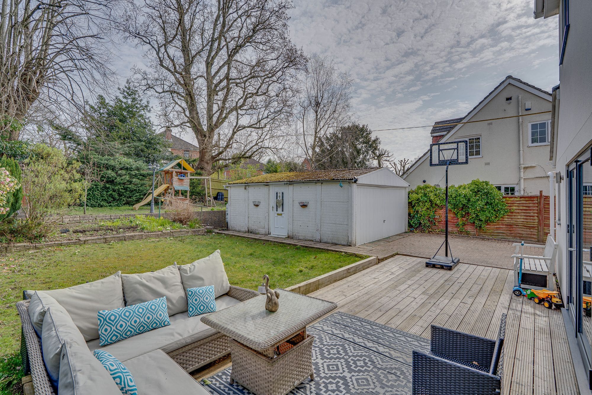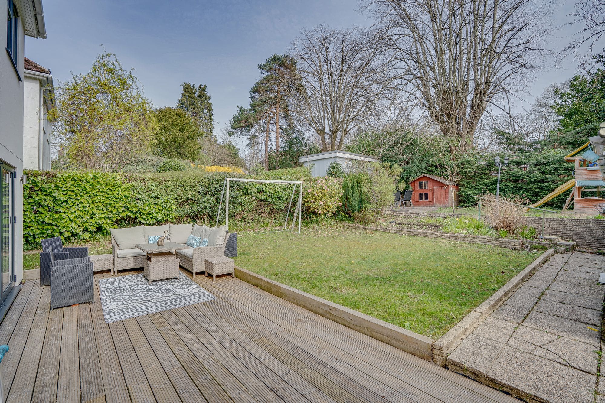 The front of the property features a spacious block-paved driveway, providing ample parking for several vehicles and leading to a detached double garage with an up-and-over door. To the rear, the landscaped garden offers a stylish decked seating area, perfect for entertaining, alongside well-maintained lawn sections, a variety of planted shrubs, and a charming wooden summer house.