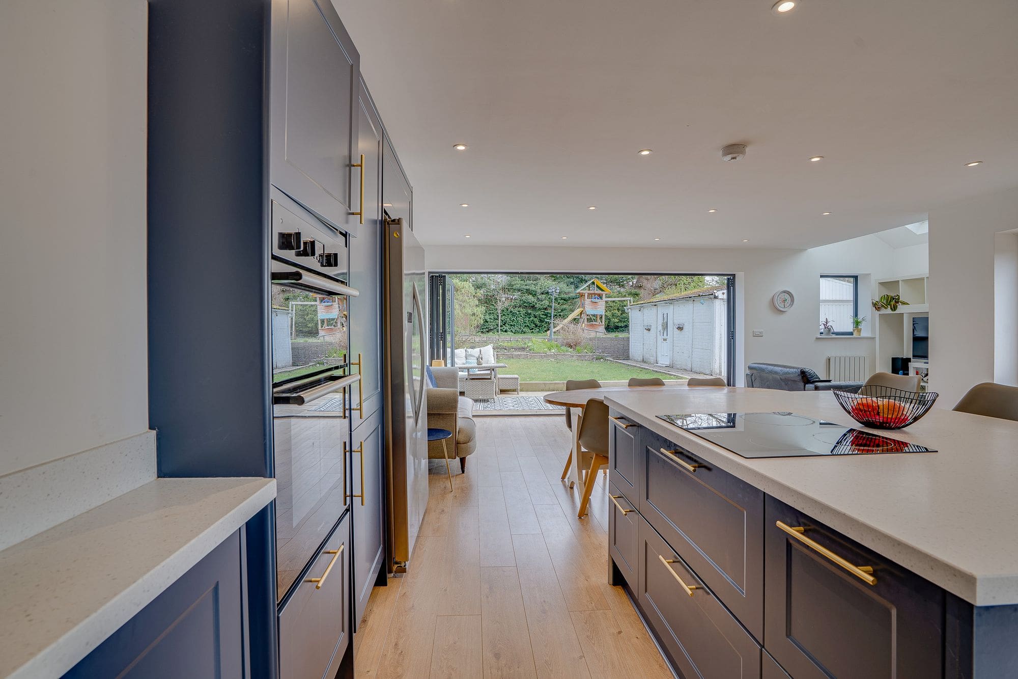 Upon entering the property, you are welcomed into a spacious entrance hall with doors leading to the main living areas and stairs rising to the first floor. To one side, the lounge offers a comfortable retreat, featuring a front-facing window and soft carpeted flooring. The true centrepiece of the home is the impressive 30ft open-plan kitchen, dining, and family room. This beautifully designed space boasts oak-effect flooring and bi-folding doors that open out to the rear, creating a seamless indoor-outdoor flow. There is ample room for both relaxed seating and a large dining table, making it perfect for entertaining and family life. The kitchen is fitted with a stylish range of wall and base units, complemented by cupboards and drawers, as well as a central island with a breakfast bar. A door from the kitchen area leads through to a practical utility room and cloakroom. Upstairs, the first floor offers four well-proportioned bedrooms. The master bedroom benefits from its own en-suite and dressing room, while the remaining bedrooms are served by a modern family bathroom.