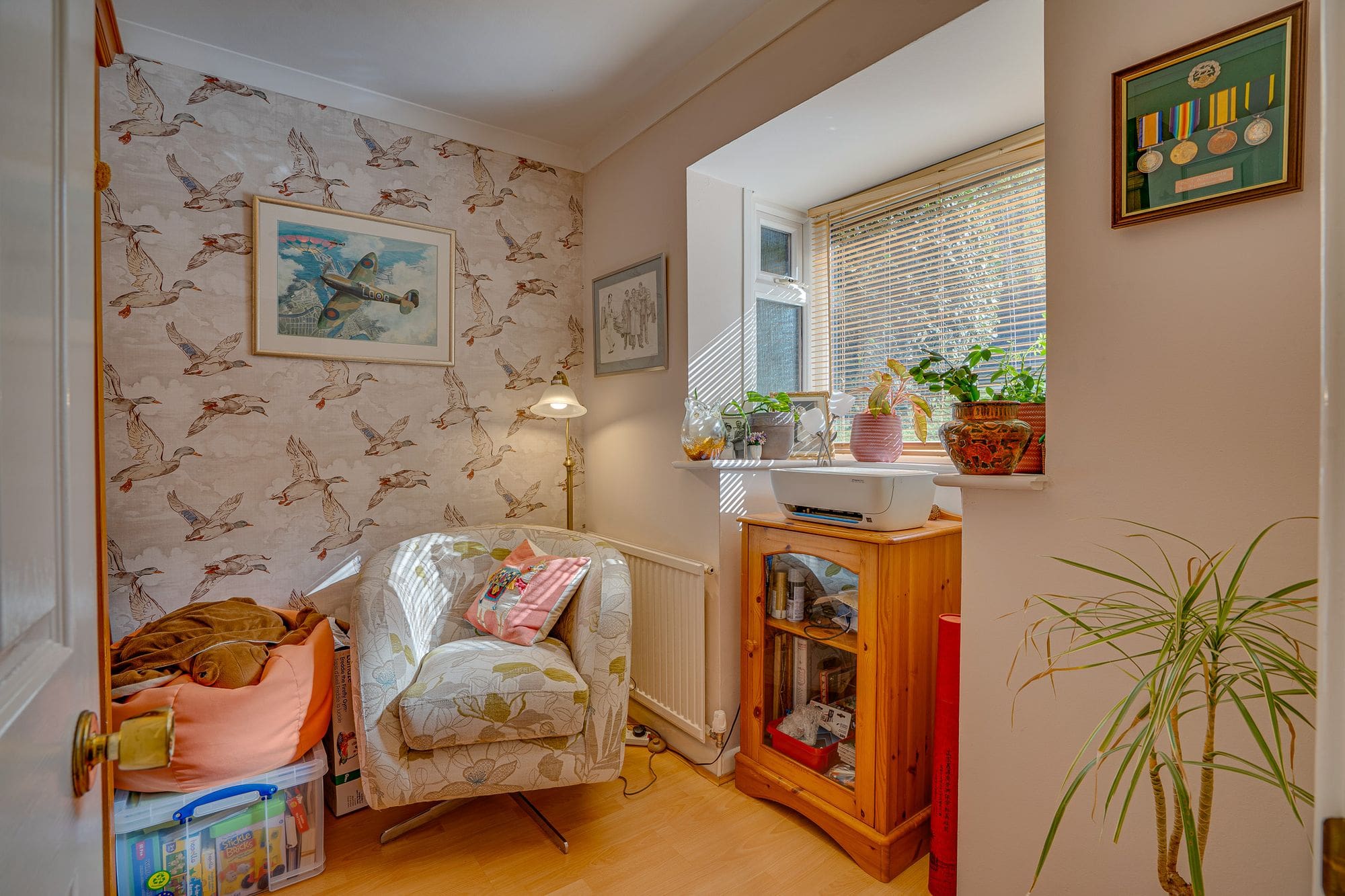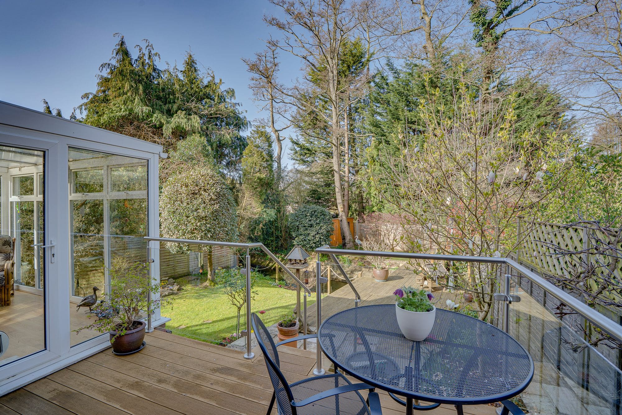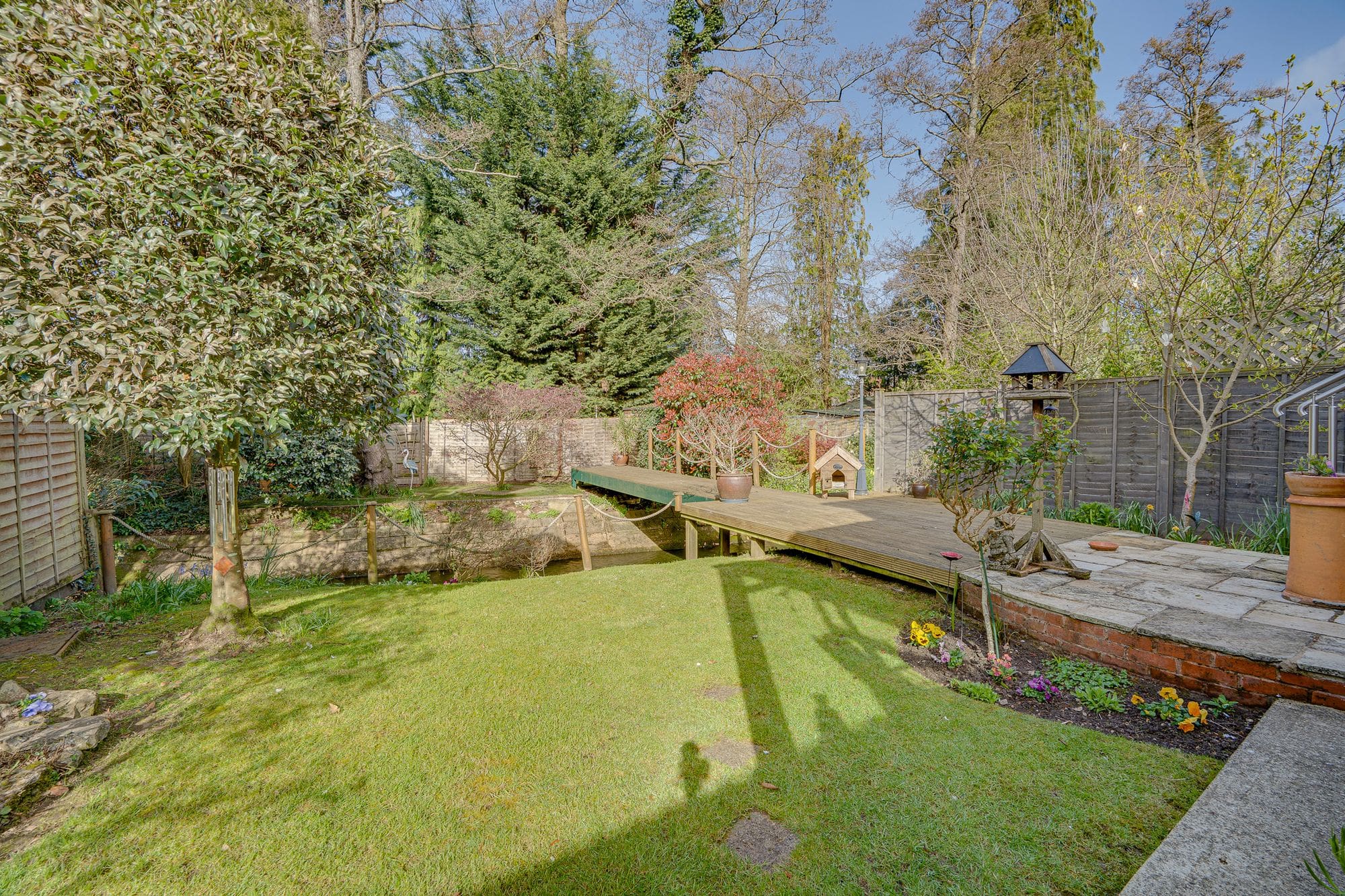 The front of the property features a driveway providing off-road parking, along with pedestrian side access leading to the rear. This also offers convenient access to both the single garage and the detached double garage, which provide excellent storage or potential for use as a workshop. The landscaped rear garden includes a raised seating area finished with composite decking, as well as an additional decked space that extends over the tranquil Monks Brook, leading to a further section laid with artificial lawn. The remainder of the garden is mainly laid to lawn and enhanced by a variety of mature trees and shrubs.
