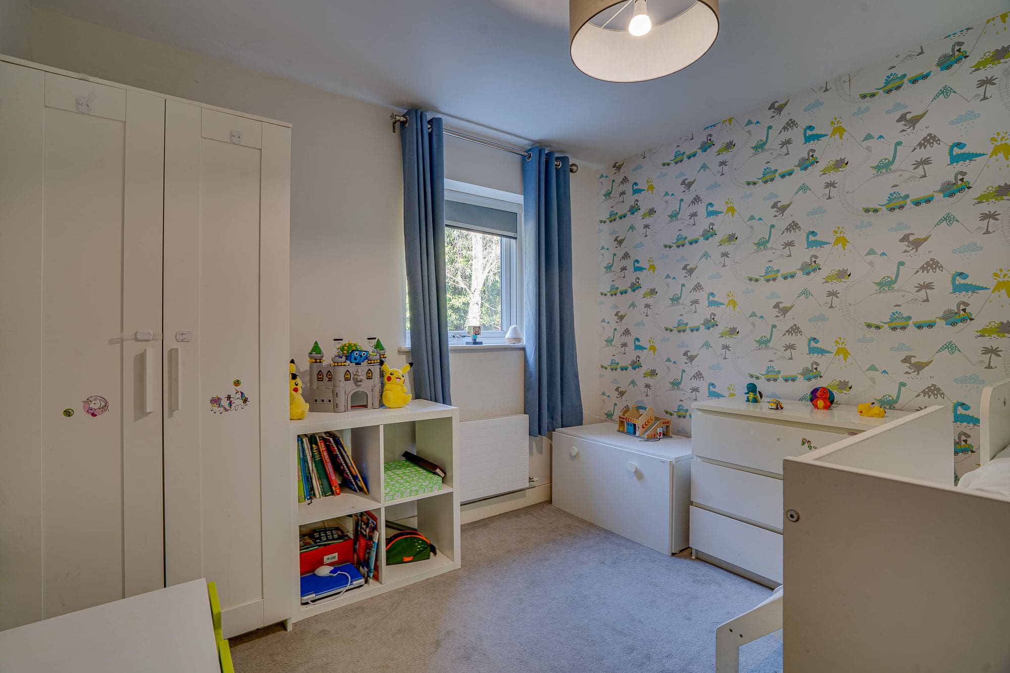 The front door opens into a spacious entrance hall, finished with herringbone-style flooring and providing access to the garage and utility room, as well as stairs rising to the first floor. The first floor features a cloakroom and further stairs leading to the second floor. The spacious lounge / dining room has plenty of space for a verity of free-standing furniture with herringbone flooring and benefits from bi-folding doors opening onto the rear garden. The kitchen is fitted with a range of wall and base units with complementary worktops, tile flooring and spotlights. The second floor landing provides access to all three bedrooms and the airing cupboard. The master bedroom enjoys a front-facing aspect with views over woodland and features fitted wardrobes and a modern en-suite shower room, comprising a shower, wash hand basin, WC, and complementary tiling. Bedrooms two and three are both well-proportioned double rooms located to the rear of the property, each enjoying views over the rear garden.