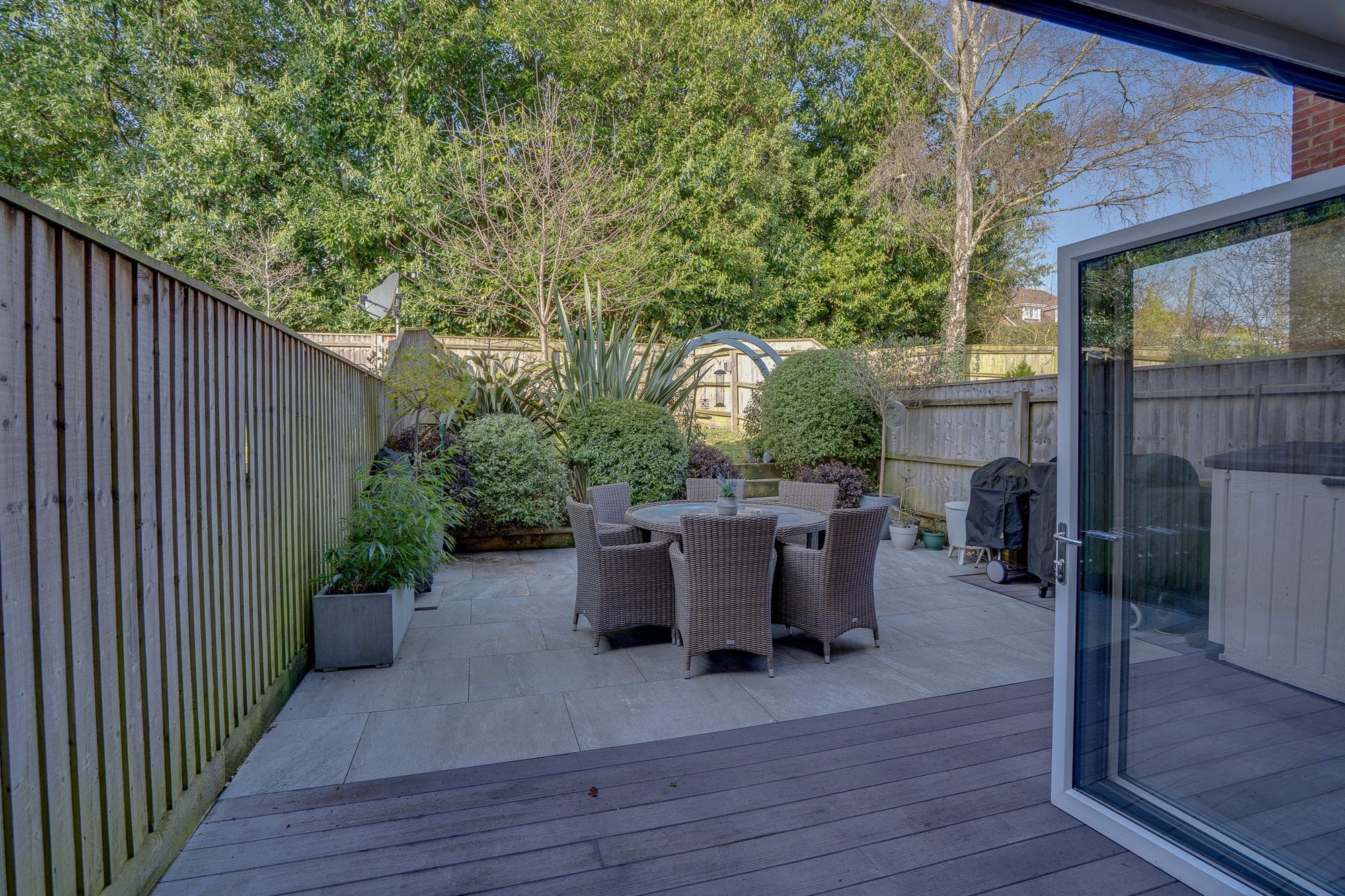 To the front of the property is a private driveway and access to the garage via an up-and-over door. The rear garden has been landscaped to include a large paved seating area, ideal for entertaining, with the remainder laid to lawn and featuring a variety of planted shrubs.